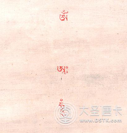 唐卡畫完后開光時,高僧大德一般在唐卡背面佛像,口意種子字"唵阿哞",以顯現(xiàn)其加持之力。"唵阿哞"三種子字是三世諸佛的心髓,也是一切佛菩薩身語意的根本種子字。