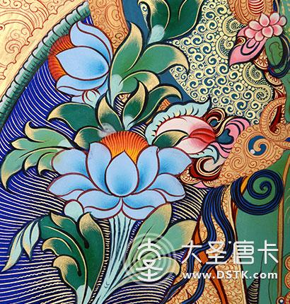 主尊、配尊的法相威嚴,花卉紋飾靈巧飄逸,舒展有度,畫面統一和諧,渾然一體,增加了畫面的層次和高度。