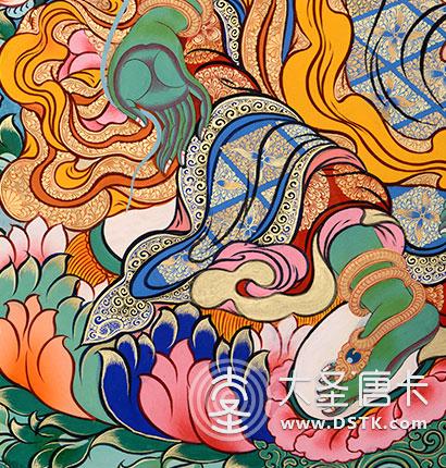 在繪制佛像服飾等位置時,用刻金技法,使圖案更具豐富的層次和立體感,用金勾勒的線條和圖案不但明亮度進一步提高,讓畫面更加燦爛,而且也使金在畫面上保持得更加長久。