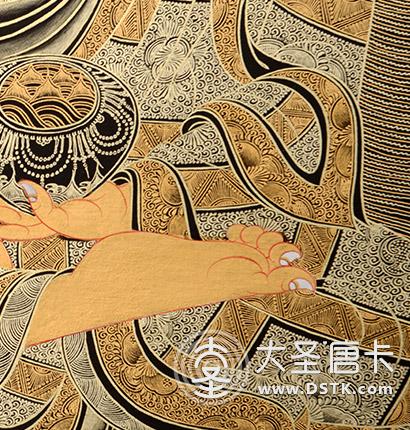 在繪制佛像服飾等位置時(shí),用刻金技法,使圖案更具豐富的層次和立體感,用金勾勒的線條和圖案不但明亮度進(jìn)一步提高,讓畫面更加燦爛,而且也使金在畫面上保持得更加長久。