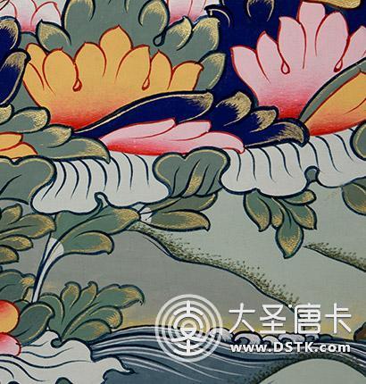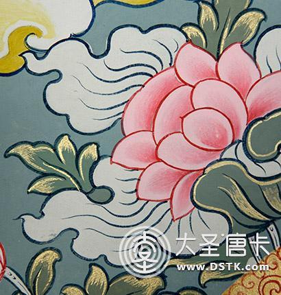 紋飾細節 深山圣水、摩尼寶珠、彩云花卉,日月同輝。整體畫工美麗,花卉紋飾靈巧飄逸,舒展有度,畫面統一和諧,渾然一體,增加了畫面的層次和高度。