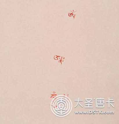 唐卡畫完后開光時,高僧大德一般在唐卡背面佛像,口意種子字"嗡阿吽",以顯現其加持之力。"嗡阿吽"三種子字是三世諸佛的心髓,也是一切佛菩薩身語意的根本種子字。