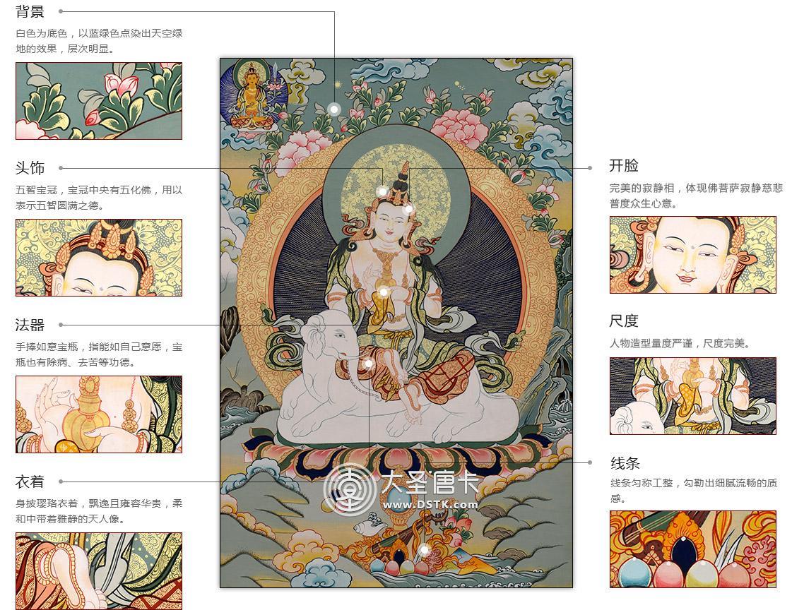本唐卡中的普賢菩薩身騎白象,一頭兩臂,身色潔白如月,頭戴花蔓寶冠,著大耳環飾、項飾、胸飾、手鐲、腳釧等珠寶八飾,面相豐滿,柳葉細眉,雙目微閉,自然下視,小口緊閉,表情慈祥,造型優美,普賢菩薩是禮德和大行愿的象征,象征真理。他以智導行,以行證智,解行并進,完成求佛者的志愿,所以又稱“大行普賢菩薩”。