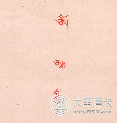 唐卡畫完后開光時,高僧大德一般在唐卡背面佛像,口意種子字"唵阿哞",以顯現其加持之力。"唵阿哞"三種子字是三世諸佛的心髓,也是一切佛菩薩身語意的根本種子字。