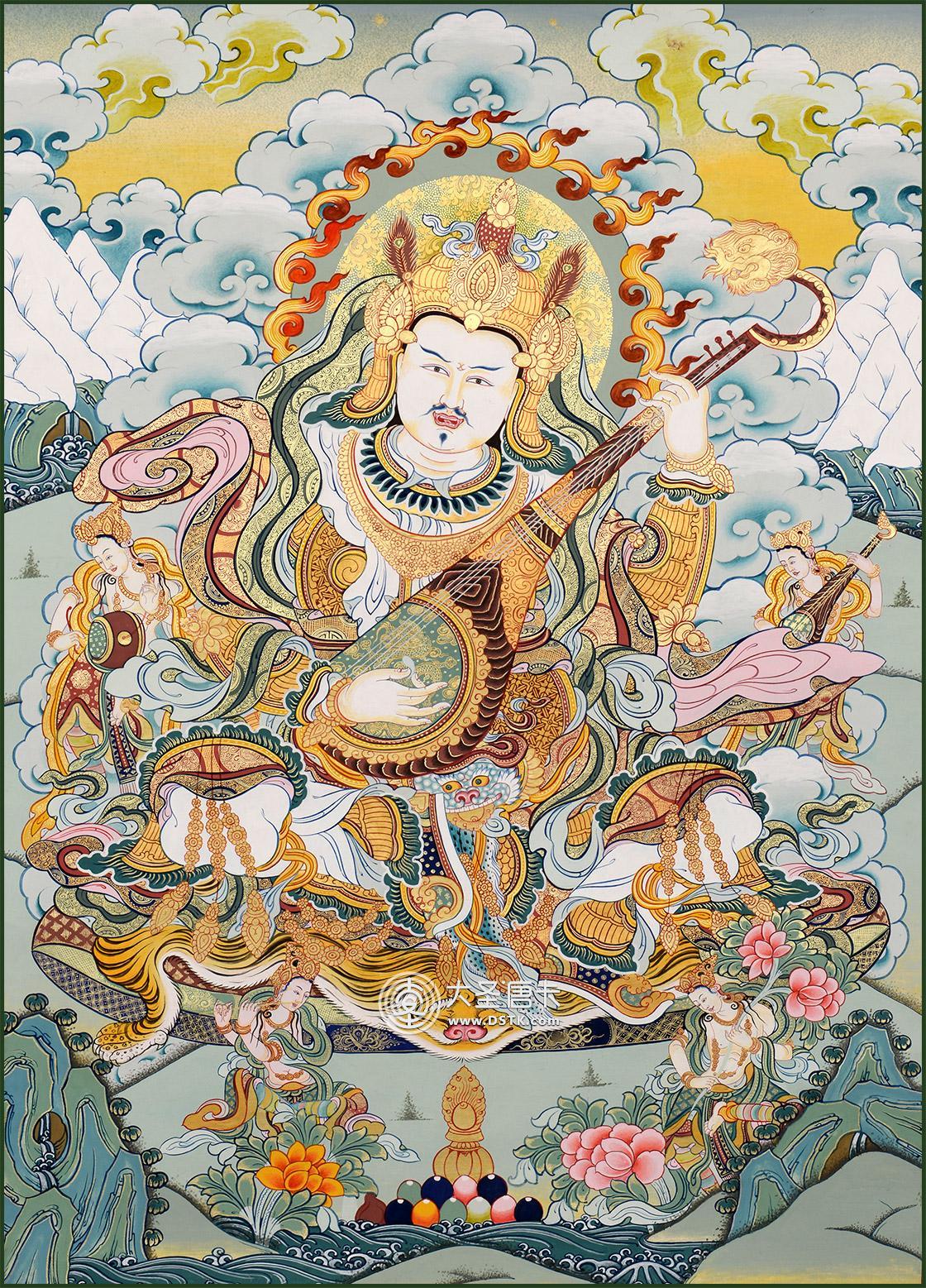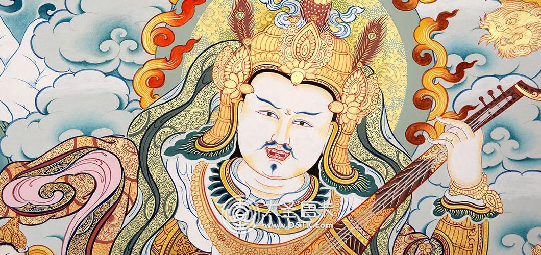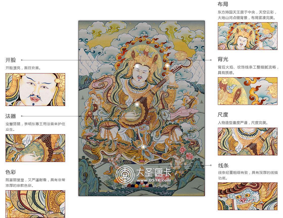 這幅以持國天王為主題的唐卡,“持國”為慈悲為懷,保護三千大千世界眾生,護持三千大千世界國土,故名東方持國尊天王。據須彌山天東方,中國大乘佛教寺廟中的普天身護法像,尊身為白色,穿甲胄,尊手持寶慧琵琶,東尊王攬勝東勝神洲。是中國佛教三十三天中的大尊天王之一。
