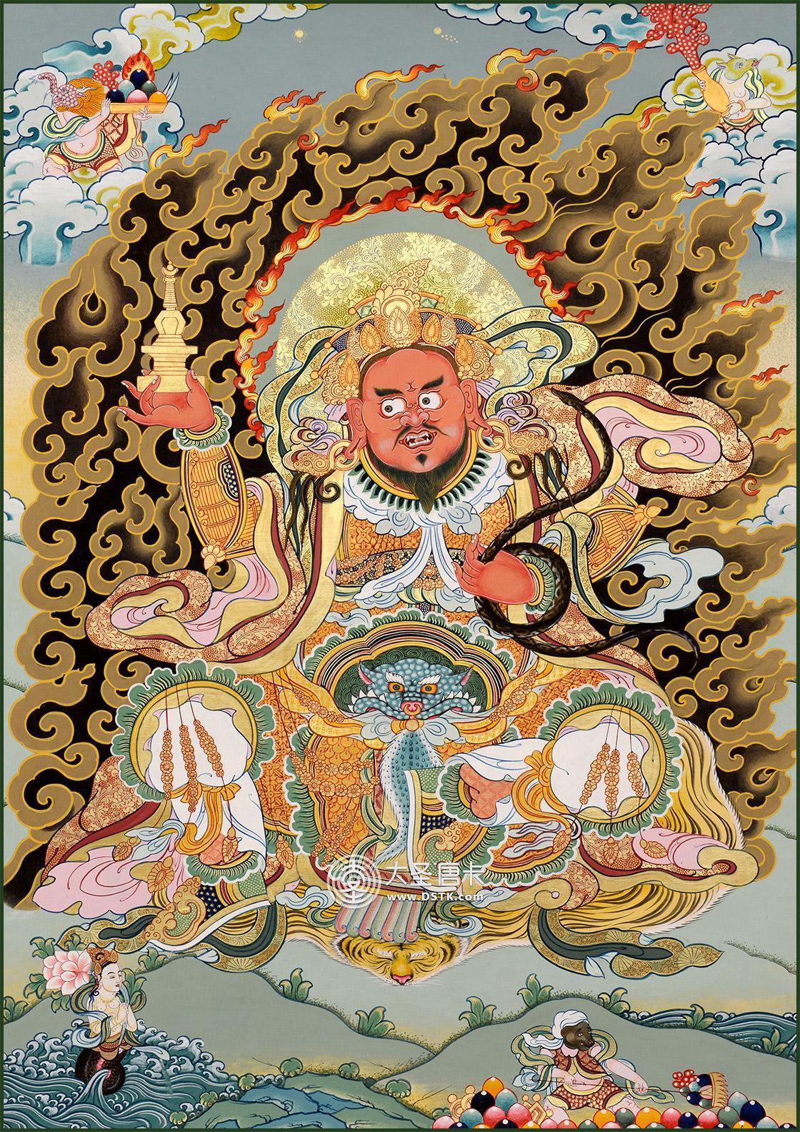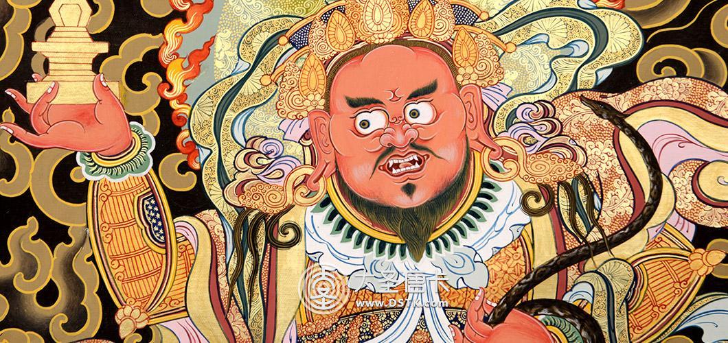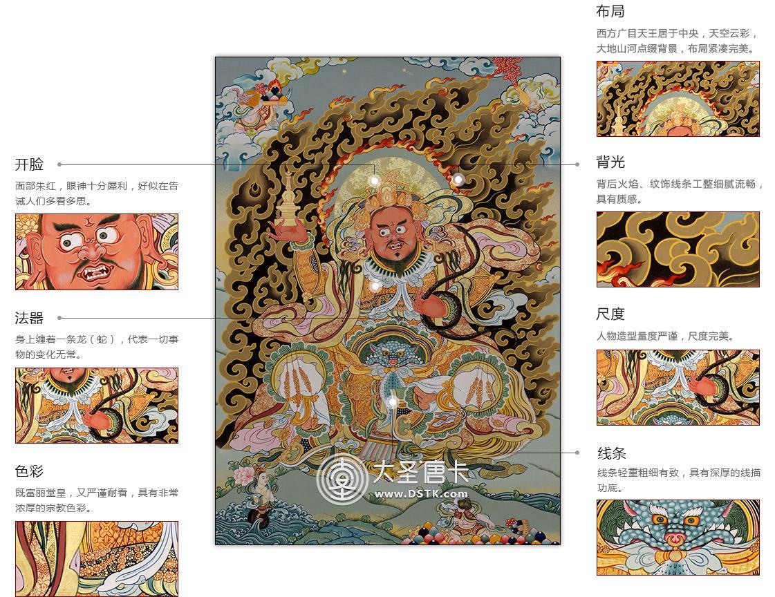 西方廣目天王身穿甲胄的武將打扮,此幅唐卡中的天王形象:身紅色,一手纏繞一龍,因為他生前是大鵬鳥,能鎮伏龍王,故一手捉龍。如果有人誹謗佛法,就立即捆綁,使其歸依佛法,另外,龍族掌管海洋,因此廣目天王也是間接掌管海洋的神,他的另一只手拿著寶塔,因眼睛有大威力,因此他總是看著另一只手。