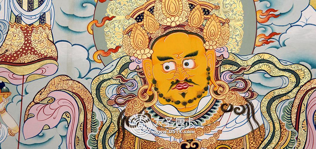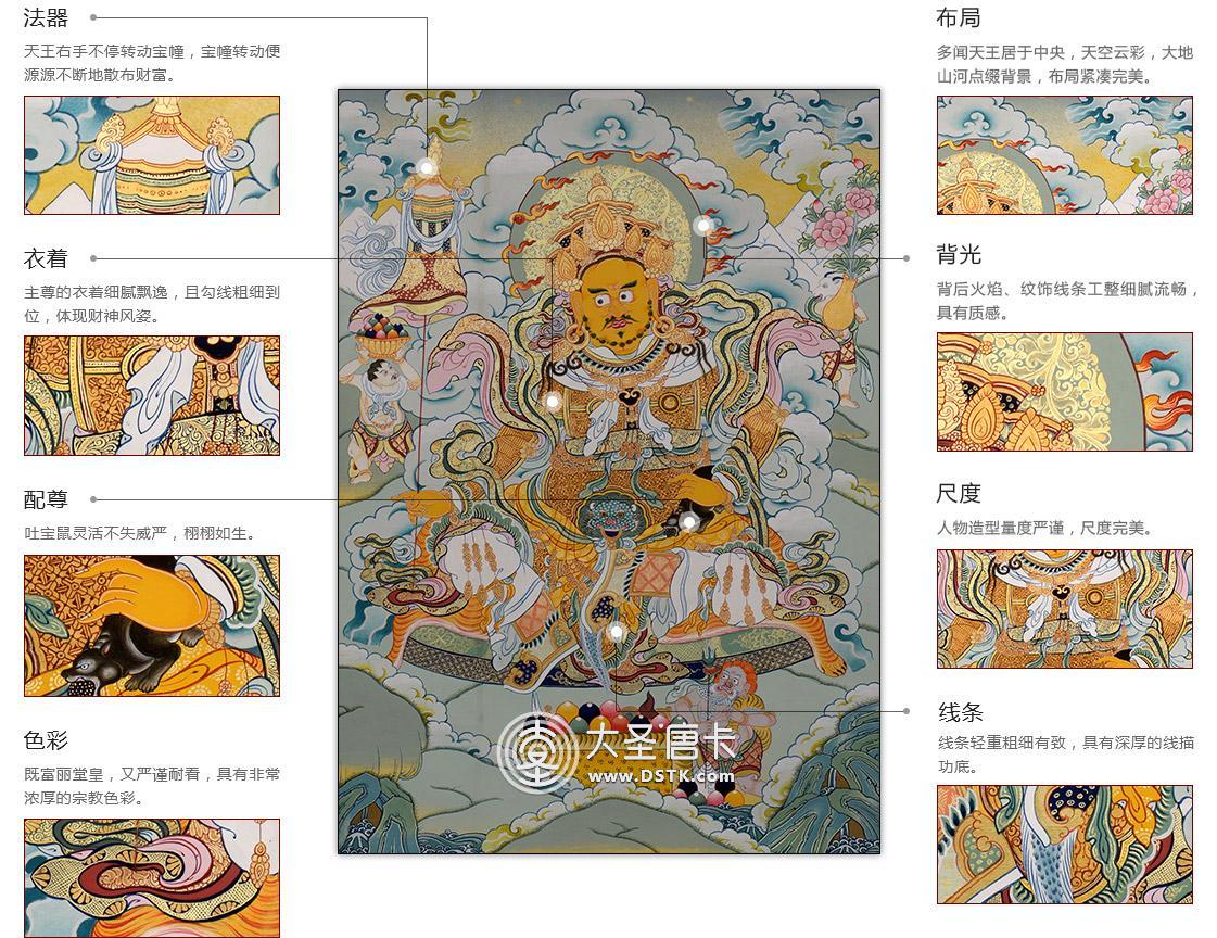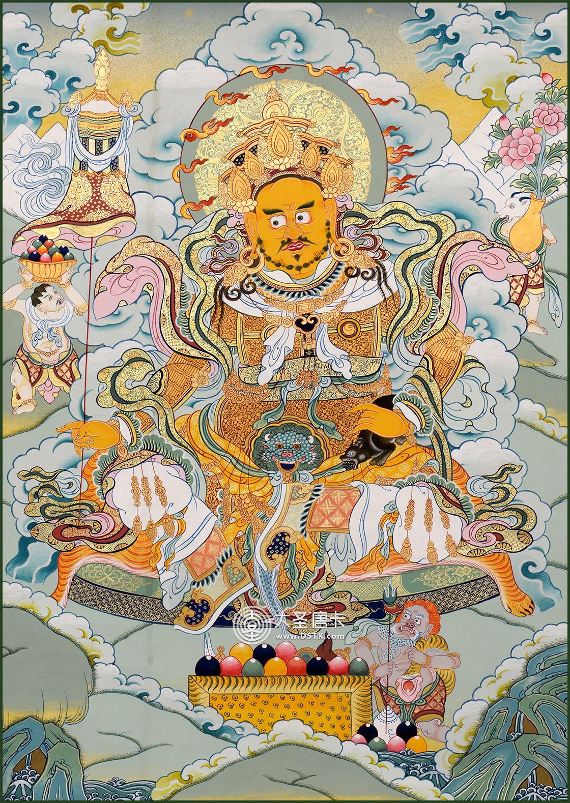 多聞天王 天王身黃色,如同金子般燦爛輝煌,從他的身上,放射出萬道光芒。頭戴綴滿珠寶的王冠,黃金的盔甲上套著華貴的絲綢天衣,圓睜兩眼,滿鬢胡須。他的左手抱著一只吐寶鼬,從鼬的嘴里能吐出取之不盡用之不竭的珍寶,由于其樂善好施,為人間布下無窮財富。