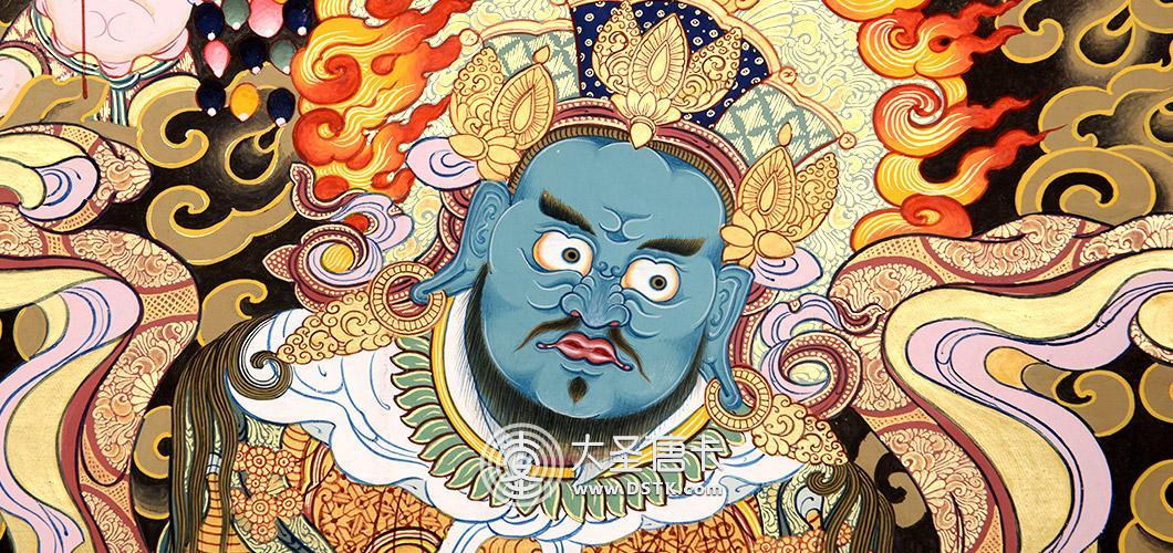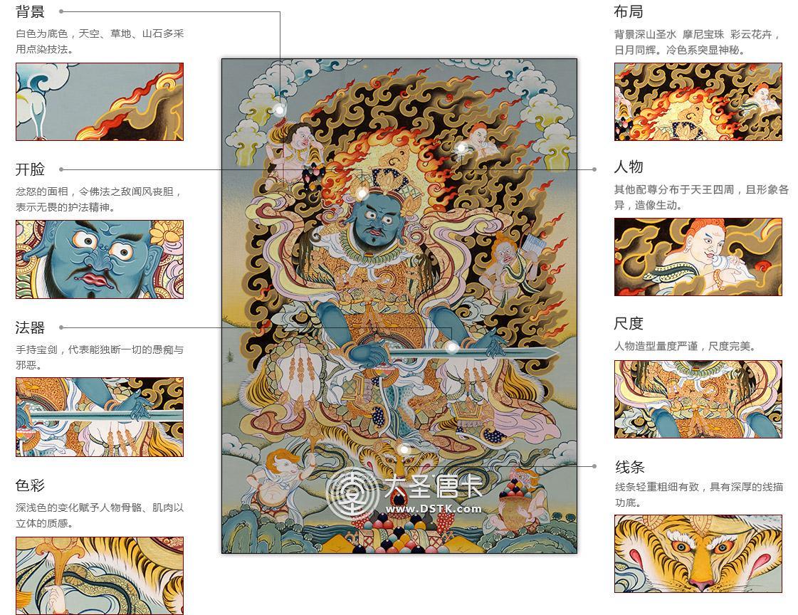 此幅唐卡中的增長天王為藍色身軀,面帶怒相,瞠目而視,象征著佛教不畏艱難,降服障礙。他手持寶劍,代表能獨斷一切的愚癡與邪惡,也是最為常見的標志之一。由于其鎮守閻王,統領鬼神,藍色面容更能增添其威猛之風。