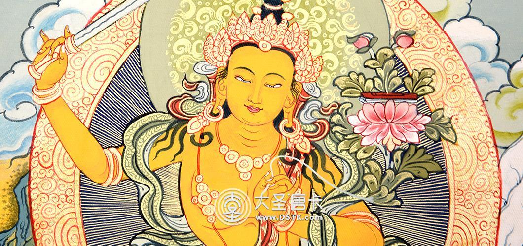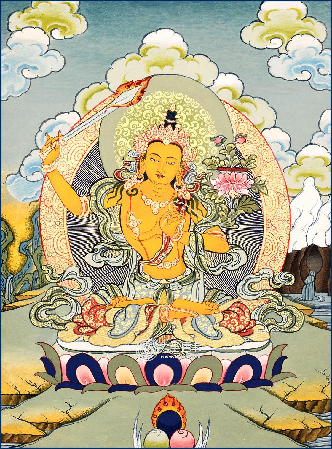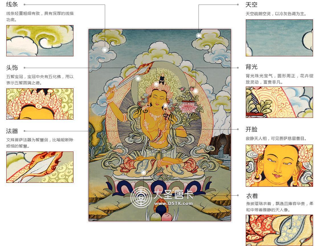 文殊菩薩又稱法王子,為智慧之象征,身金色,形如童子,五髻冠其項,右手持金剛寶劍(表示智能之利),能斬群魔,斷一切煩惱,左手持青蓮花,花上有金剛般若經卷寶,象征所具無上智慧,坐于蓮花臺上。