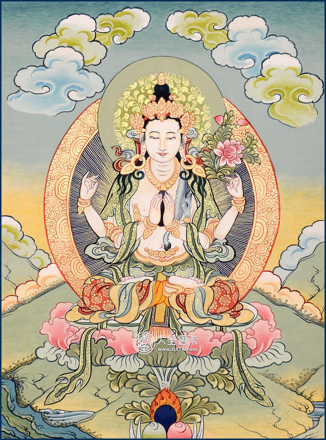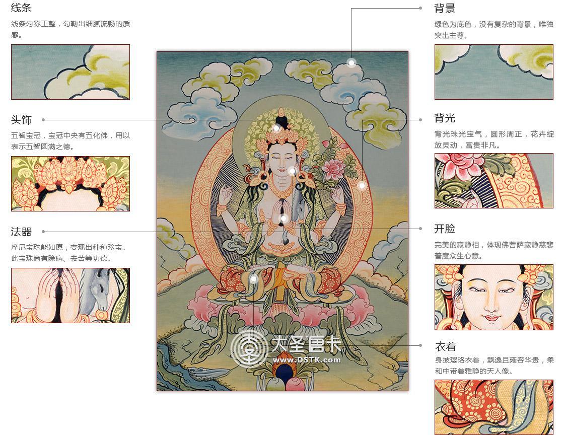 在此幅唐卡中,四臂觀世音菩薩以寂靜相于蓮花臺座結跏趺坐。左右主手合十手捧如意寶,座前供有摩尼寶珠。左次手持蓮花,表示清凈無惱。四臂觀世音一首意為通達法性,四臂意為四無量心,身色潔白表示潔白無瑕,不被煩惱困擾。四臂觀世音菩薩雙眼注視著世間蒼生,表示被注視者可得到解脫。