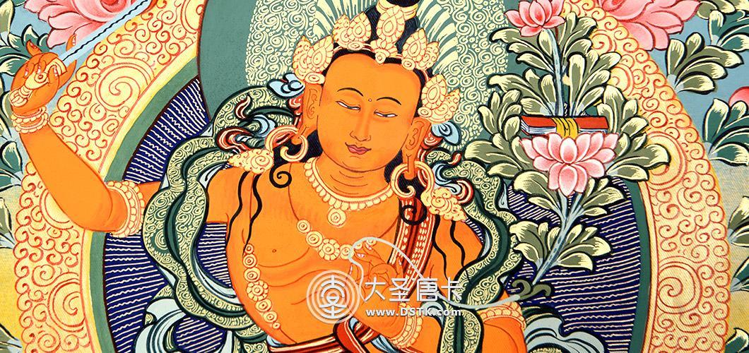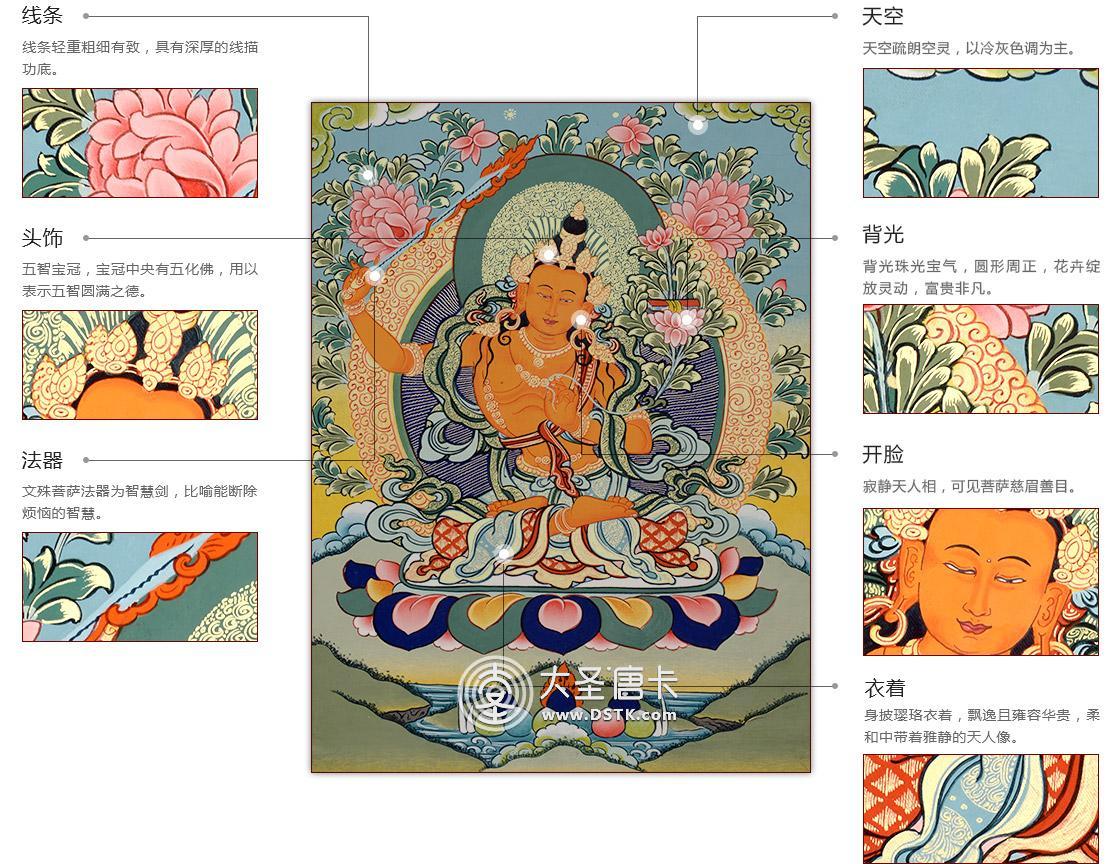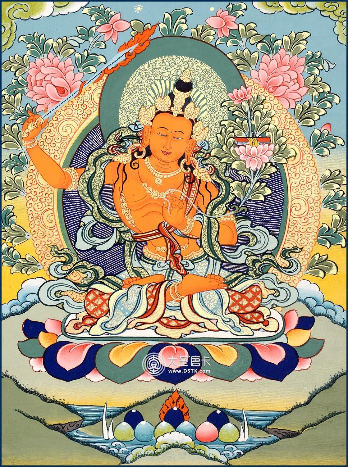 文殊菩薩又稱法王子,為智慧之象征,身金色,形如童子,五髻冠其項,右手持金剛寶劍(表示智能之利),能斬群魔,斷一切煩惱,左手持青蓮花,花上有金剛般若經卷寶,象征所具無上智慧,坐于蓮花臺上。