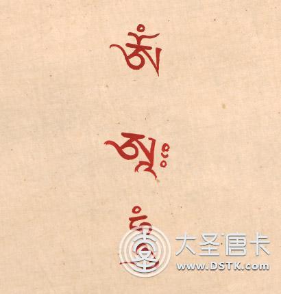 唐卡畫完后開光時,高僧大德一般在唐卡背面佛像,口意種子字"嗡阿吽",以顯現其加持之力。"嗡阿吽"三種子字是三世諸佛的心髓,也是一切佛菩薩身語意的根本種子字。
