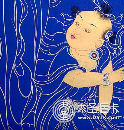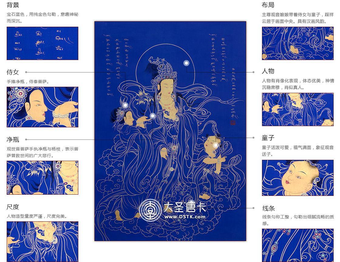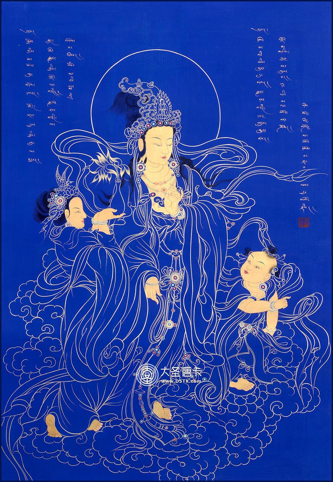 產地:熱貢 工藝:藍唐 創作年份:2016 題材:送子觀音 繪制時間:12月 尺寸:*68*96cm 裝裱:無裱 材質: 使用場地: