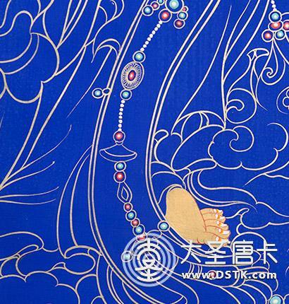 采用涂金、磨金、勾金線、刻金、染金的絕技,將金色分成多種冷暖變化,在藍底上用金線勾畫不同的層次效果,對比強烈,畫面富麗堂皇。