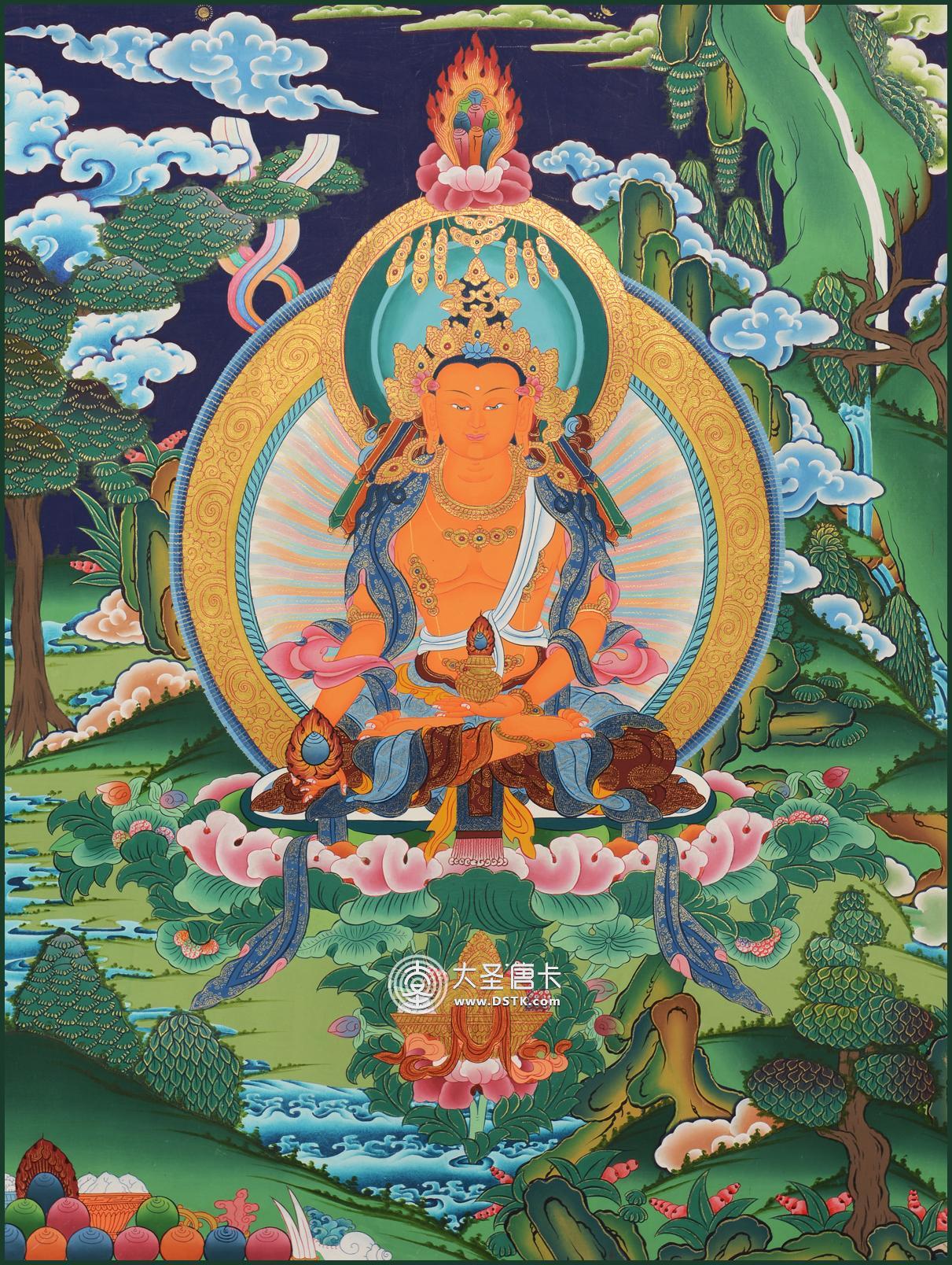 “長壽佛”是藏傳佛教中對“圣無量壽智決定光明王如來”的略稱,亦簡稱為“無量壽智如來”。一面二臂,肌膚紅色,盤發成髻戴五佛寶冠,上穿天衣,下著綢裙,身佩珍寶瓔珞,具足一切報身佛的種種莊嚴。