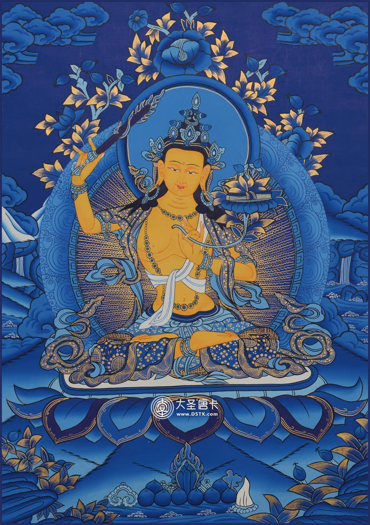 文殊菩薩又稱法王子,為智慧之象征,身金色,形如童子,五髻冠其項,右手持金剛寶劍(表示智能之利),能斬群魔,斷一切煩惱,左手持青蓮花,花上有金剛般若經卷寶,象征所具無上智慧,坐于蓮花臺上。