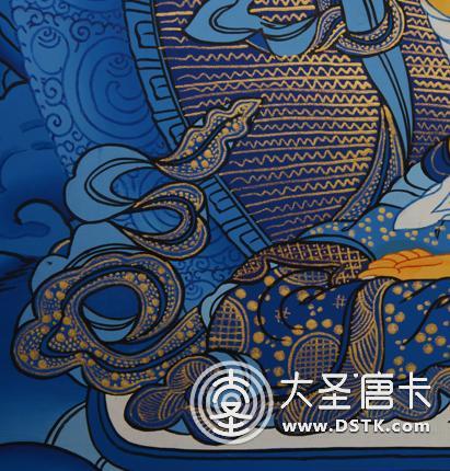 在繪制佛像服飾等位置時,用刻金技法,使圖案更具豐富的層次和立體感,用金勾勒的線條和圖案不但明亮度進一步提高,讓畫面更加燦爛,而且也使金在畫面上保持得更加長久。