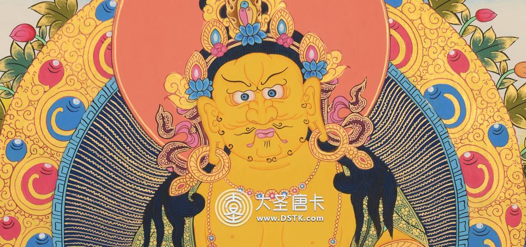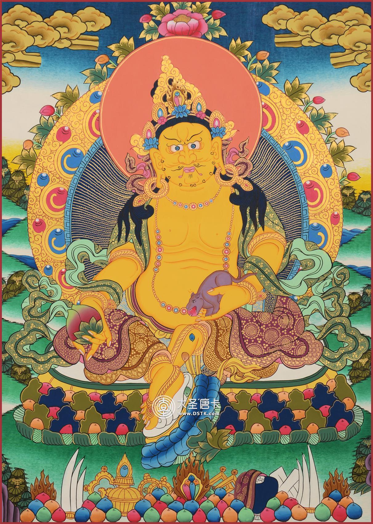 彩唐黃財神一面二臂,五佛冠為頭飾,矮小肚大,雙臂勁力,右手持布拉噶如意寶,左手提著吐寶鼠,身著天衣,藍蓮花及珠寶瓔珞作裝飾,胸前掛念珠。左足屈,右足踩著海螺寶,以如意姿安座于蓮花月輪之上。