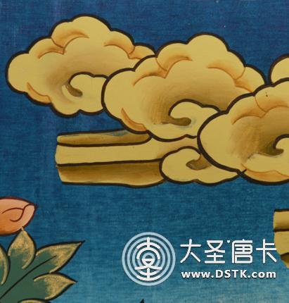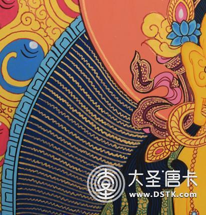 在繪制佛像服飾等位置時,用刻金技法,使圖案更具豐富的層次和立體感,用金勾勒的線條和圖案不但明亮度進一步提高,讓畫面更加燦爛,而且也使金在畫面上保持得更加長久。
