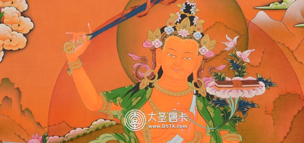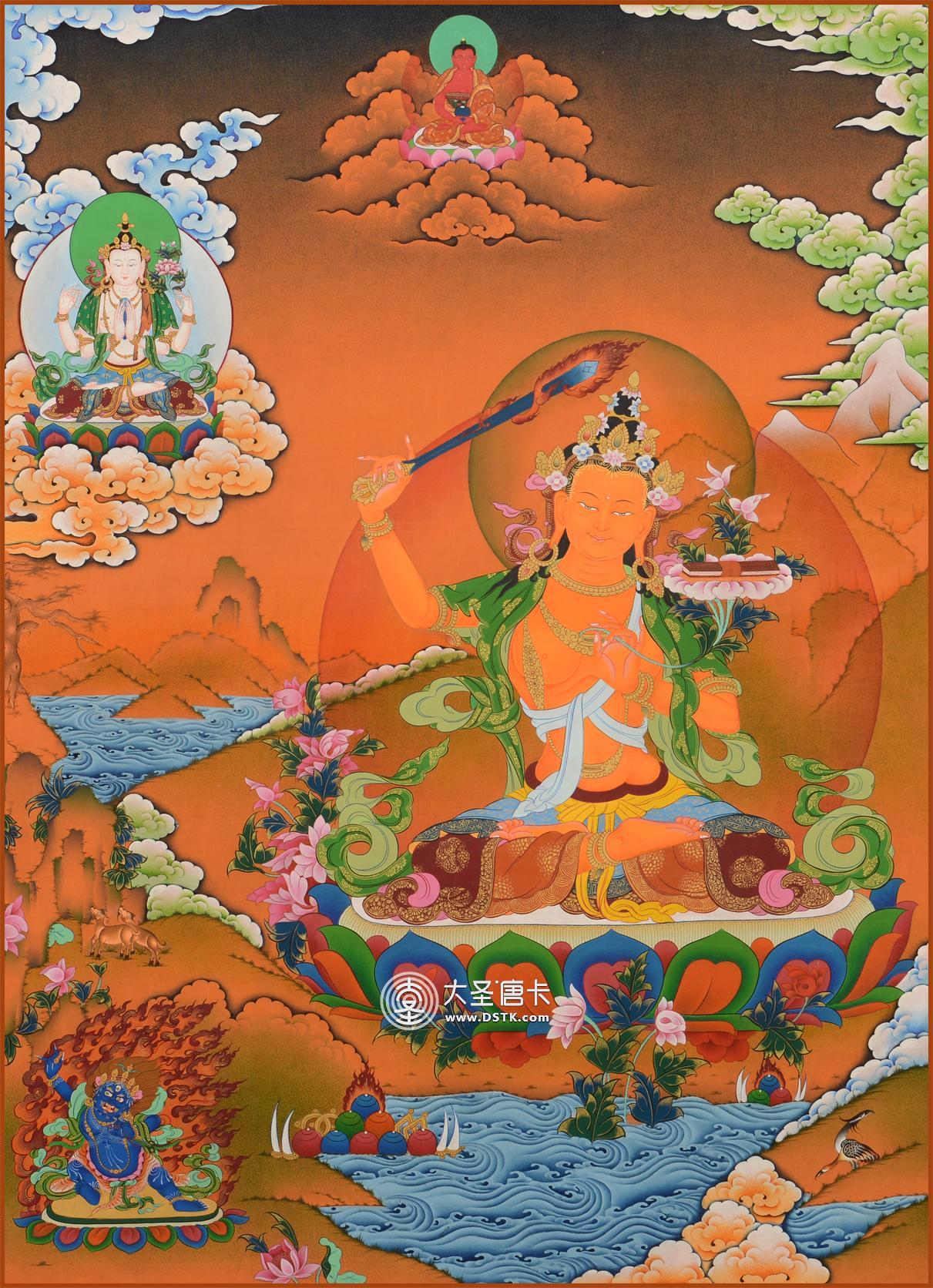 文殊菩薩又稱法王子,為智慧之象征,身金色,形如童子,五髻冠其項,右手持金剛寶劍(表示智能之利),能斬群魔,斷一切煩惱,左手持青蓮花,花上有金剛般若經卷寶,象征所具無上智慧,坐于蓮花臺上。
