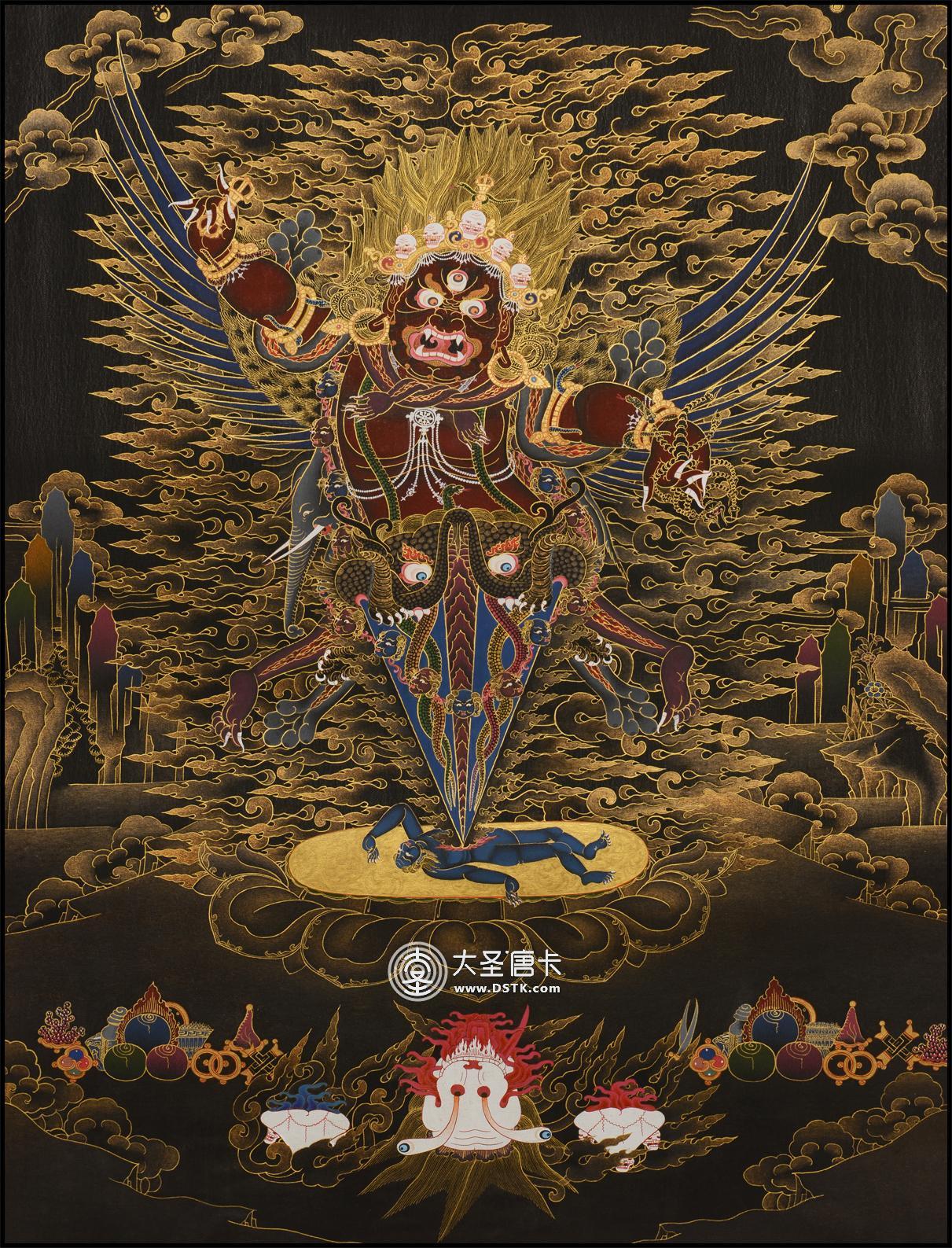 本尊身黑紅色,具有二臂、三目,背后生雙翼,如劍銳利,頸掛三串人首發,面涂三色,表三毒清凈,頭戴五骷冠,表示以五方佛的智慧作頭上裝飾,身披象皮 - 表降伏愚癡、人皮 - 表降伏貪愛,若虎皮裙 - 表降伏嗔恨。 右二足踏男魔之背,左二足踏女魔之胸,表降服四魔,安住于般若智焰之中。 頸上蛇飾表本尊具足降伏龍族,能統治一切之威力。