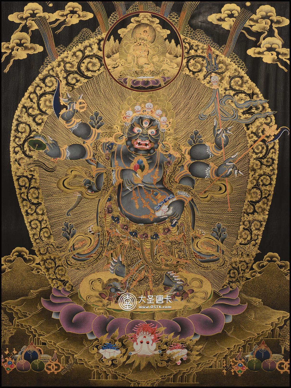 白色六臂大黑天,為財神之一,手持摩尼寶、鉞刀、小鼓及三叉、顱器等,威神甚大。大黑天又意譯為大黑、大時、大黑神或大黑天神等,或者直接音譯為摩訶迦羅、莫訶哥羅、瑪哈嘎拉等名稱。該神本是婆羅門教濕婆的變身,后為佛教吸收而成為佛教的護法,特別是在密宗中大黑天是重要的護法神。