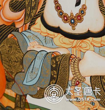 尼泊爾畫派特有畫風,紋飾栩栩如生,花卉紋飾靈巧飄逸,舒展有度,畫面統一和諧,渾然一體,增加了畫面的層次和高度。