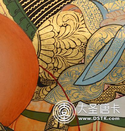 在繪制佛像服飾等位置時,用刻金技法,使圖案更具豐富的層次和立體感,用金勾勒的線條和圖案不但明亮度進一步提高,讓畫面更加燦爛,而且也使金在畫面上保持得更加長久。