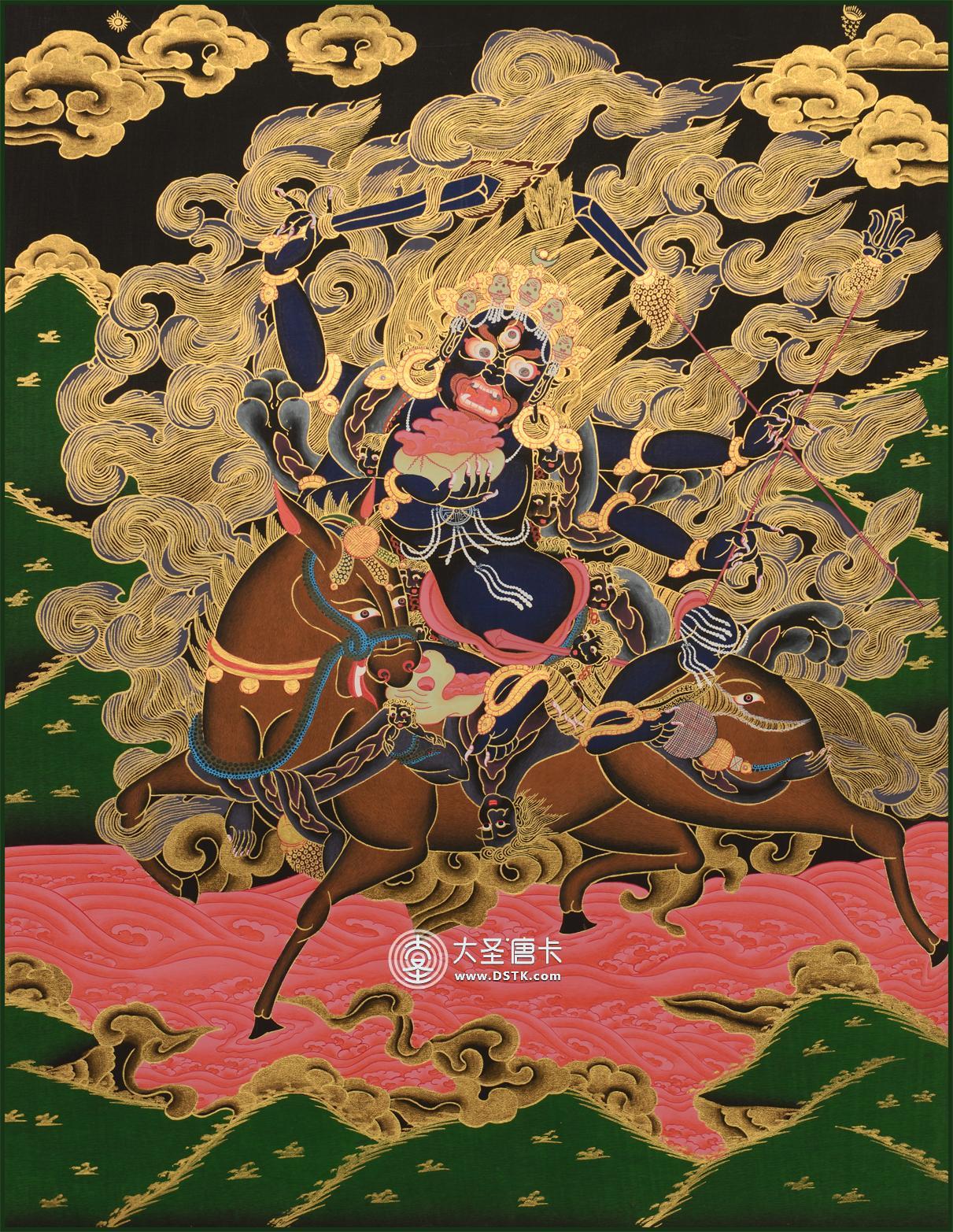 吉祥天母,在藏傳佛教中地位很高,是屬于出世間的護法,各教派都有修。吉祥天母騎一頭四個眼的騾子(胯下左右各一眼),可以在天上、地上、地下三界遍處行走,故也稱騾子天王。她是印度教中地位最高的幸運和財富女神。