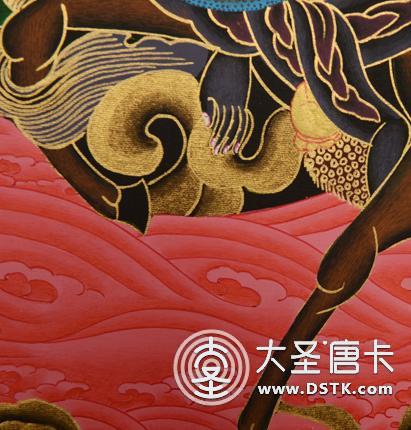 采用涂金、磨金(磨銀)、勾金線、刻金、染金的絕技,將金色分成多種冷暖變化,在黑地上用金線勾畫十幾種不同的層次效果,對比強烈,畫面富麗堂皇。