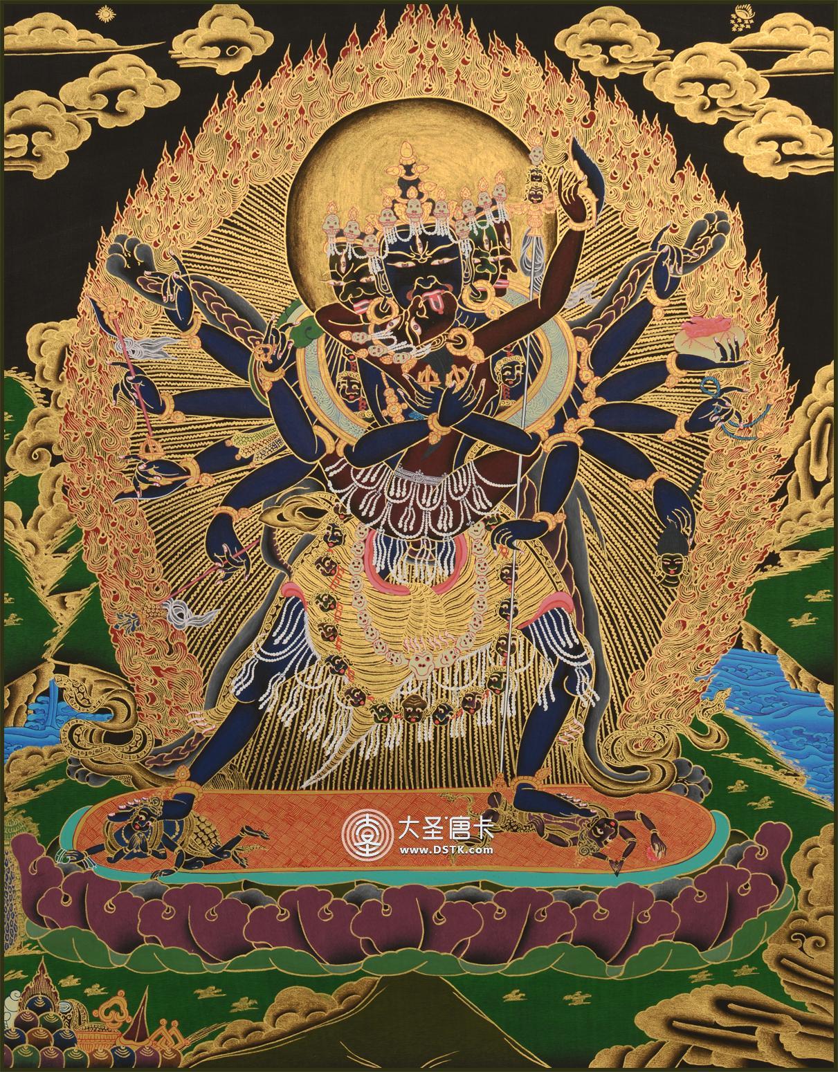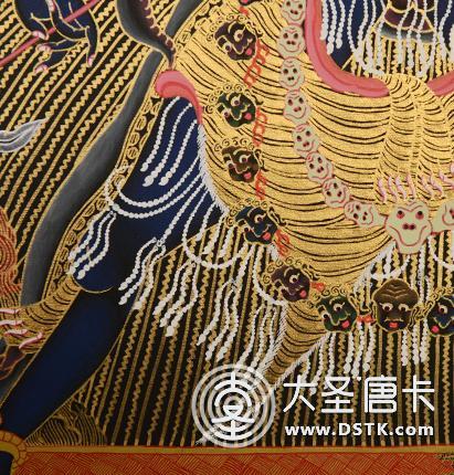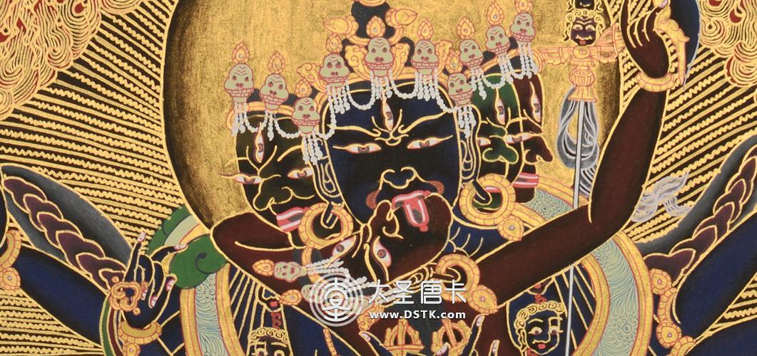 主尊四面臉均為怒相,其正面像頭戴骷髏冠,項掛長及腳踝的骷髏人頭項鏈,腿部飾綠松石、瑪瑙鑲嵌的瓔珞,左腳踏婆羅門教主神時間女神,右腳踏印度教主神濕婆,全臂抱金剛亥母,余臂持法器,金剛亥母一手持刀,一手托嘎巴拉碗,擁抱主尊項,面部表情似怒非怒,主尊后身像有余臂拉展的象皮。