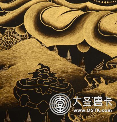 采用涂金、磨金、勾金線、刻金、染金的絕技,將金色分成多種冷暖變化,在黑地上用金線勾畫十幾種不同的層次效果,對比強烈,畫面富麗堂皇。