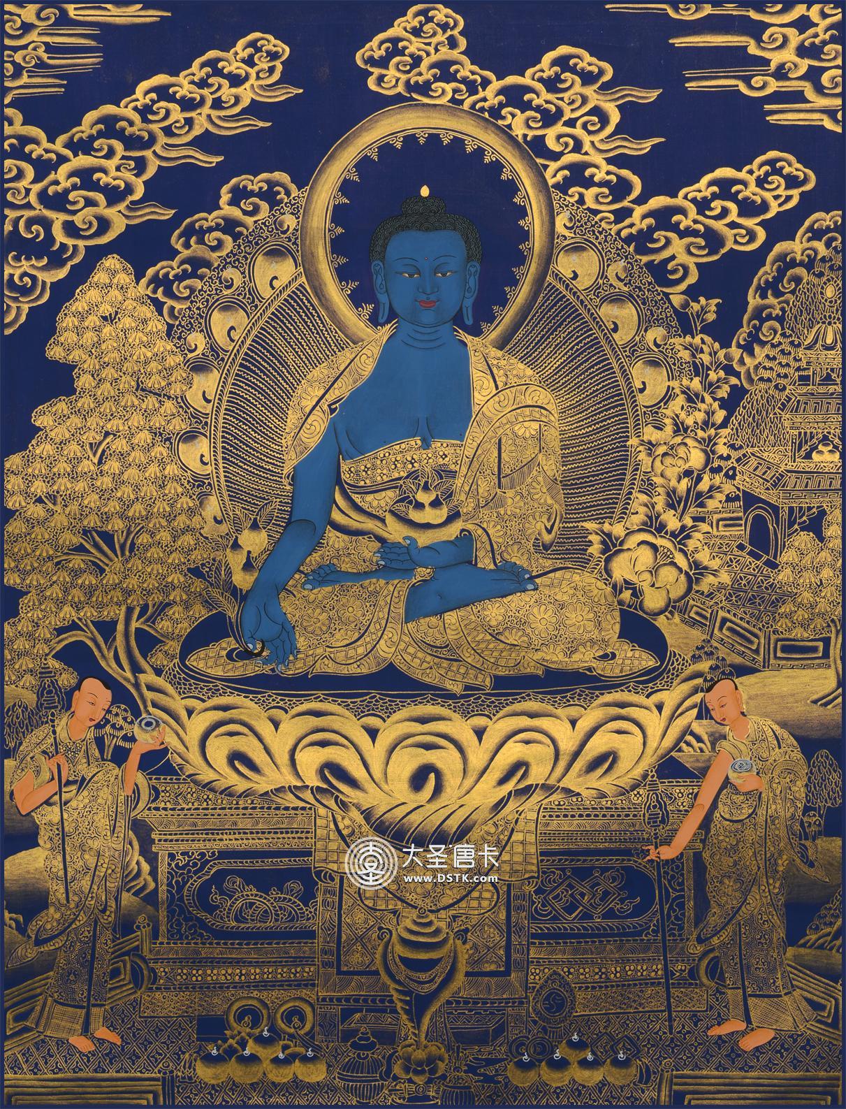 此唐卡中心主尊為凈琉璃佛土之藥師琉璃光如來;藥師佛面相慈祥圓潤,儀態莊嚴,身呈藍色,烏發肉髻,雙耳垂肩,身披佛衣,坦胸露右臂,右手膝前施與愿印,執持一株藥草,左手臍前以禪定印捧藥器,雙足跏趺于蓮花寶座中央。