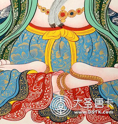 在繪制佛像服飾等位置時,用刻金技法,使圖案更具豐富的層次和立體感,用金勾勒的線條和圖案不但明亮度進一步提高,讓畫面更加燦爛,而且也使金在畫面上保持得更加長久。