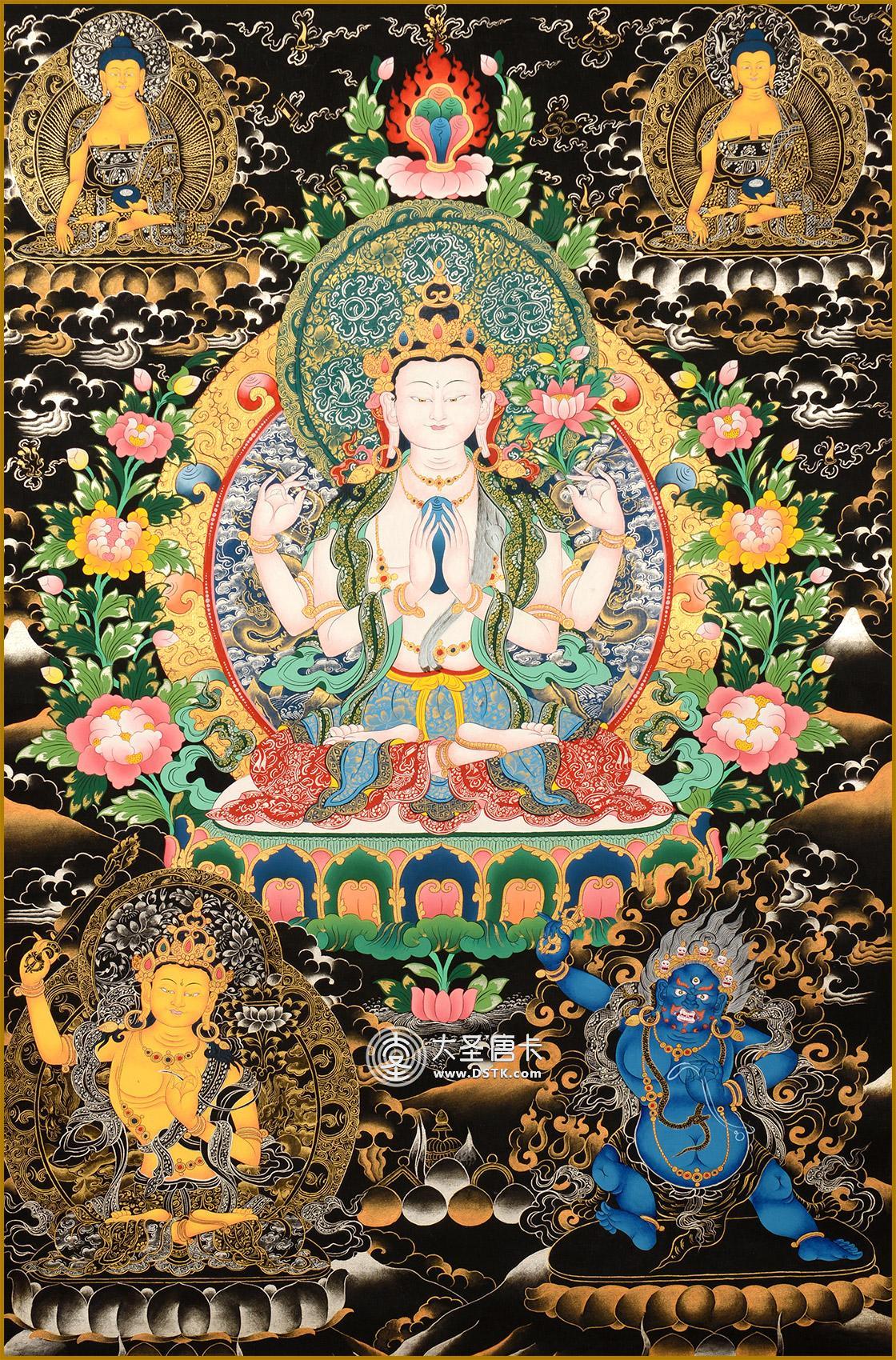 四臂觀音是雪域西藏的守護神,藏人由老至幼家家戶戶,皆吟誦其六字大明咒:“嗡嘛呢叭咪吽”。廣大藏蒙佛教徒還把達賴喇嘛奉為觀音化身, 四臂觀音輿文殊菩薩、金剛手菩薩,合稱三族姓尊。代表大悲、大智、大力,為密乘行者人人必修的法門。