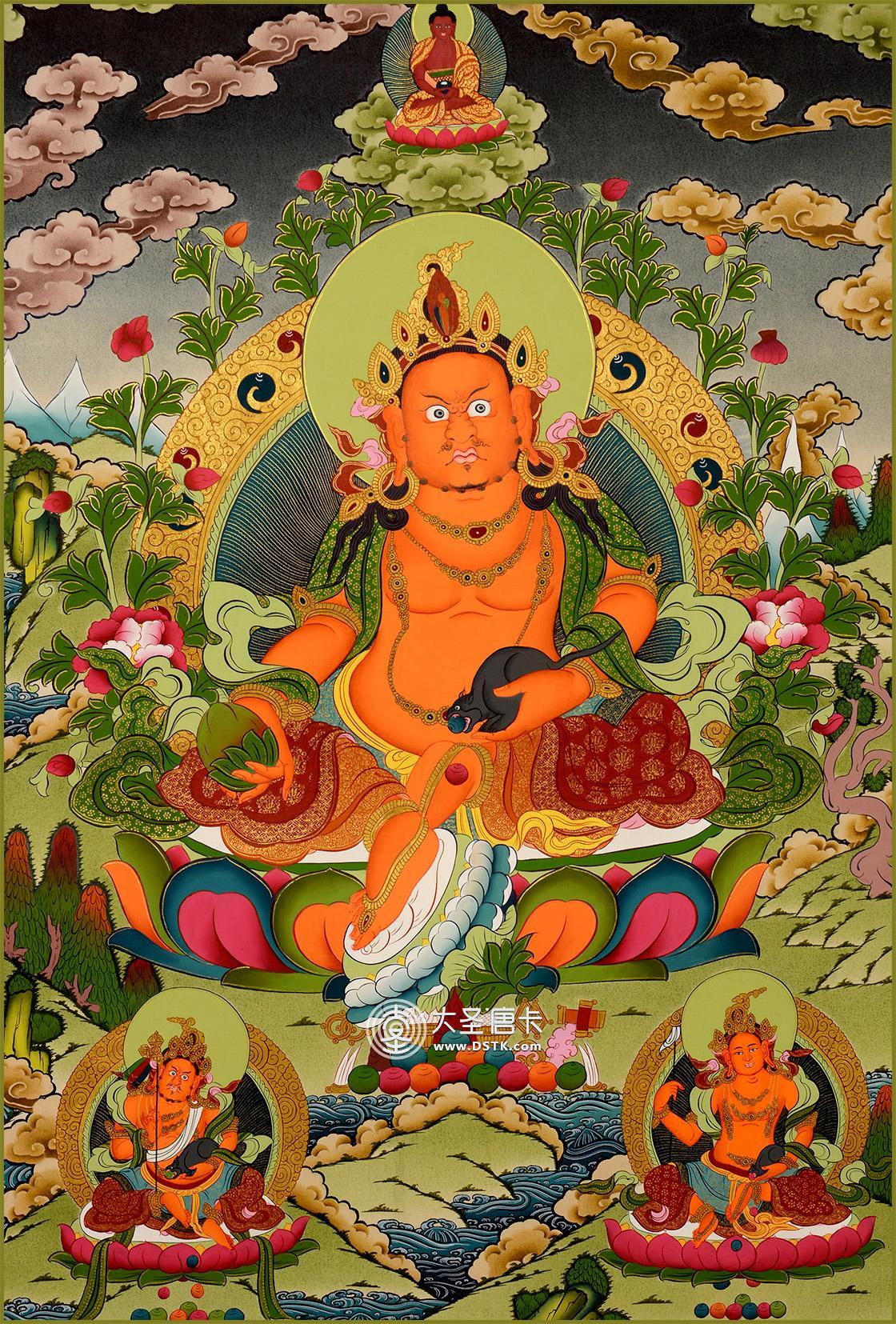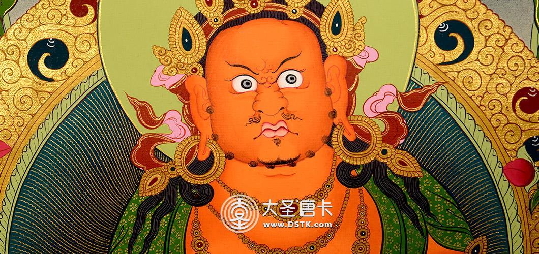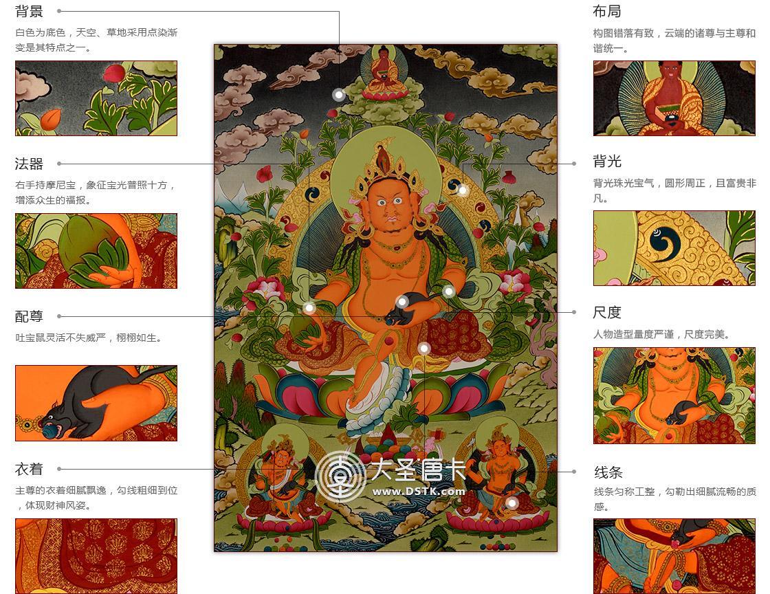 彩唐黃財神一面二臂,五佛冠為頭飾,矮小肚大,雙臂勁力,右手持布拉噶如意寶,左手提著吐寶鼠,身著天衣,藍蓮花及珠寶瓔珞作裝飾,胸前掛念珠。左足屈,右足踩著海螺寶,以如意姿安座于蓮花月輪之上。