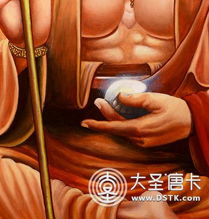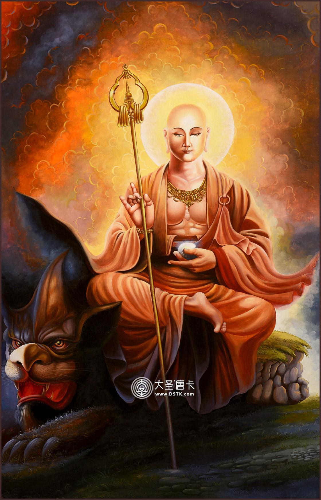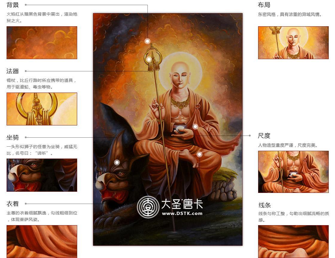 地藏菩薩因立下度盡六道中生死流轉的眾生的大愿,故而常現身于人、天、地獄等六道之中,而有六地藏之稱。此幅唐卡為寶珠地藏王,身披袈裟,一手持錫杖,一手持寶珠。左手持寶珠,右手結甘露印,專門救度餓鬼道。