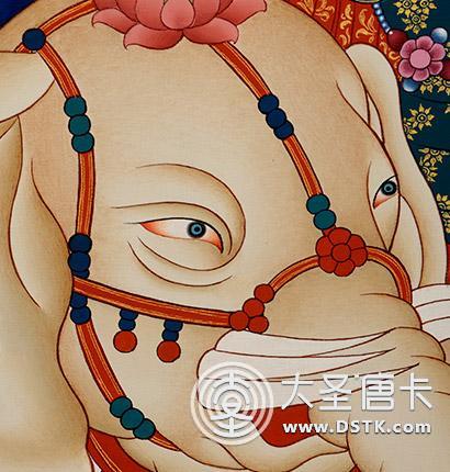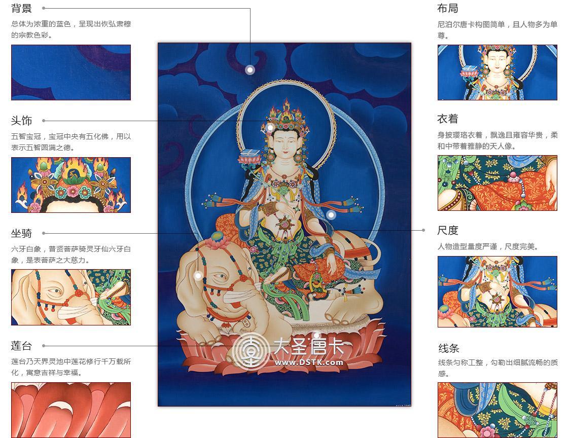本唐卡中的普賢菩薩身騎六牙白象,一頭兩臂,身色潔白如月,頭戴花蔓寶冠,著大耳環飾、項飾、胸飾、手鐲、腳釧等珠寶八飾,面相豐滿,柳葉細眉,雙目微閉,自然下視,小口緊閉,表情慈祥,造型優美,普賢菩薩是禮德和大行愿的象征,象征真理。他以智導行,以行證智,解行并進,完成求佛者的志愿,所以又稱“大行普賢菩薩”。
