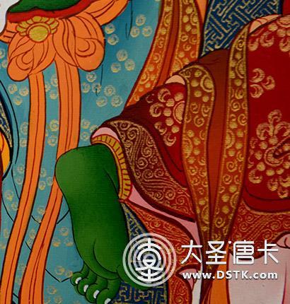 主尊法相慈祥,花卉紋飾靈巧飄逸,舒展有度,畫(huà)面統(tǒng)一和諧,渾然一體,增加了畫(huà)面的層次和高度。