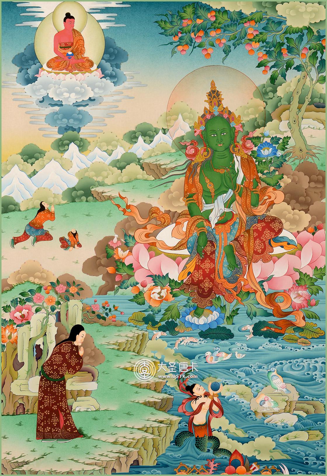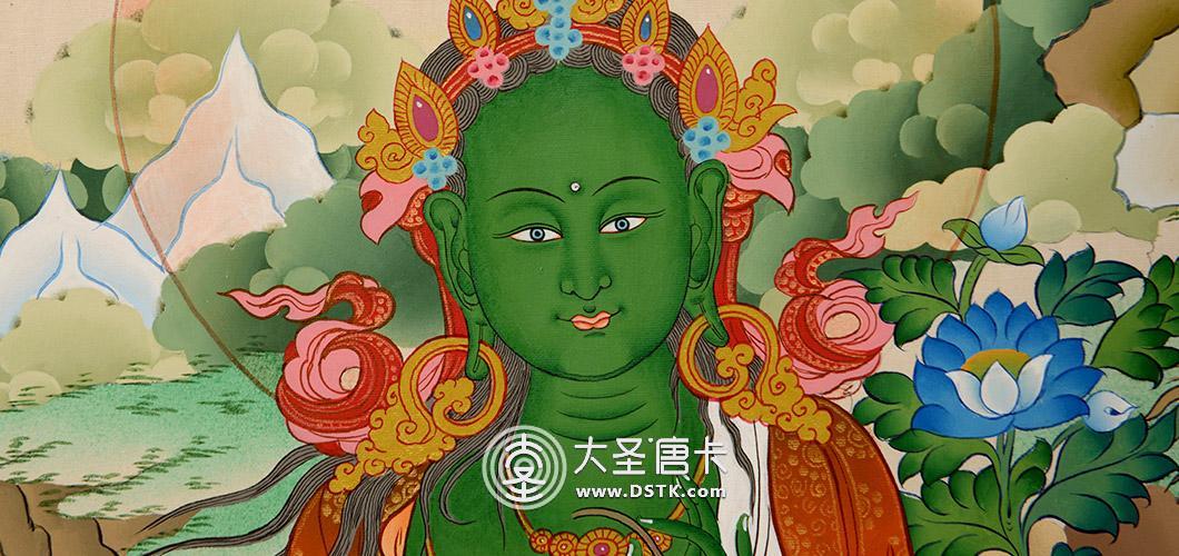 綠度母為觀世音菩薩的化身。度母,梵名Tara,全稱圣救度佛母,綠度母為所有度母之主尊,總攝其余二十尊化身之所有功德。她能救八種苦難,如獅難、象難、蛇難、水難、牢獄難、賊難、非人難,又稱為“救八難度母”。