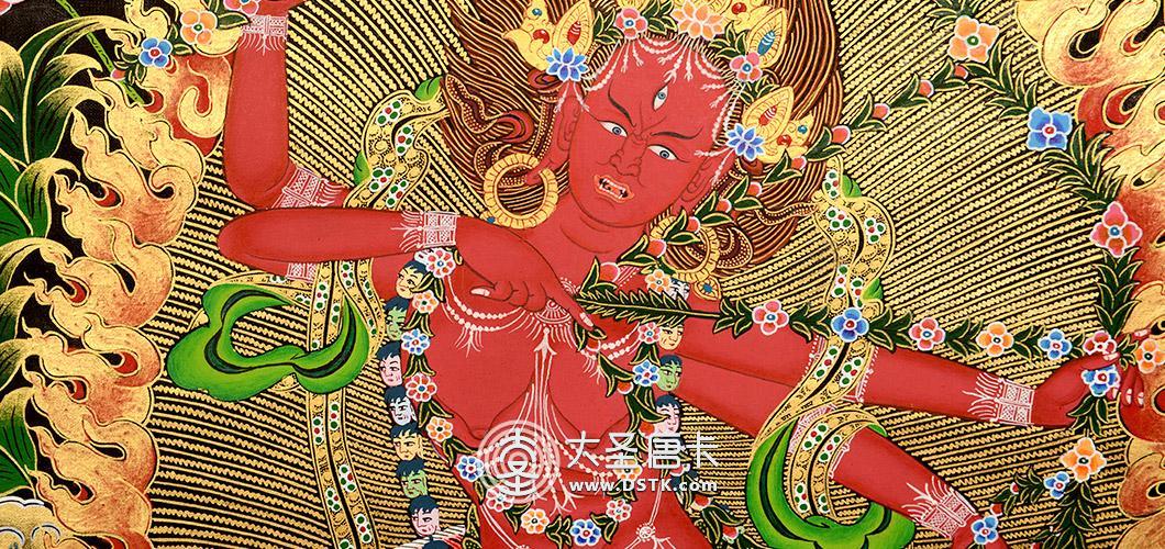 作明佛母,一面四臂、具三目,橘紅發上沖,以五骷髏為冠,五十顆人頭為項鬘發網、耳垂、腕鐲、臂環、脛釧、腋絡等骨飾莊嚴。身紅色,三目圓睜,卷舌,露齒。右腳屈曲,左腳鶴立,左踏赤裸外道魔女之心口上,以蓮花日輪為座。虔修此法舉凡諸般世俗男女婚嫁,有情人終成眷屬、人緣佳、聰慧、貌美等,念其咒不僅速應且懷柔六道眾生、利益解脫輪回,諸多利益不勝言表。
