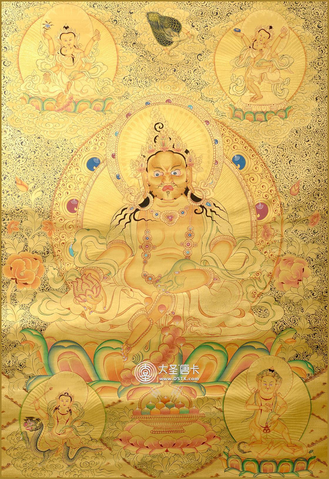 黃財神一面二臂,矮小肚大,雙臂勁力,右手持布拉噶如意寶,左手提著吐寶鼠,身著天衣,珠寶瓔珞作裝飾,胸前掛念珠。左足屈,右足踩著海螺寶,以如意姿安座于蓮花月輪之上。