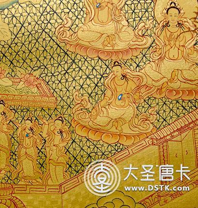 從材料上講,有用金、銀、瑪瑙、珍珠、孔雀石、珊瑚、松耳石等珍貴的礦物和次等寶石來制作顏料。還有用土法提取的大黃、藏紅花、藍靛等植物顏料。繪制時以礦物顏料為主,輔以天然植物色的暈染,再用純金勾描出畫面的輝煌燦爛,這樣的唐卡作品不易變色、歷久彌新。