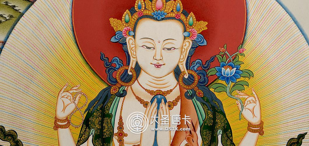 四臂觀音是雪域西藏的守護神,藏人由老至幼家家戶戶,皆吟誦其六字大明咒:“嗡嘛呢叭咪吽”。廣大藏蒙佛教徒還把達賴喇嘛奉為觀音化身, 四臂觀音輿文殊菩薩、金剛手菩薩,合稱三族姓尊。代表大悲、大智、大力,為密乘行者人人必修的法門。