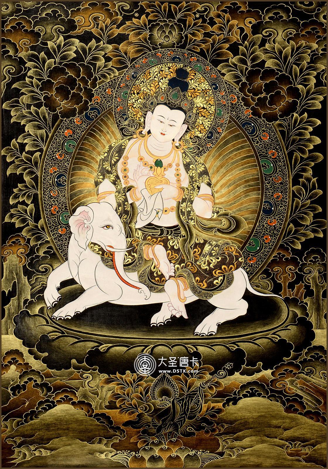 本唐卡中的普賢菩薩身騎白象,一頭兩臂,身色潔白如月,頭戴花蔓寶冠,著大耳環飾、項飾、胸飾、手鐲、腳釧等珠寶八飾,面相豐滿,柳葉細眉,雙目微閉,自然下視,小口緊閉,表情慈祥,造型優美,普賢菩薩是禮德和大行愿的象征,象征真理。他以智導行,以行證智,解行并進,完成求佛者的志愿,所以又稱“大行普賢菩薩”。