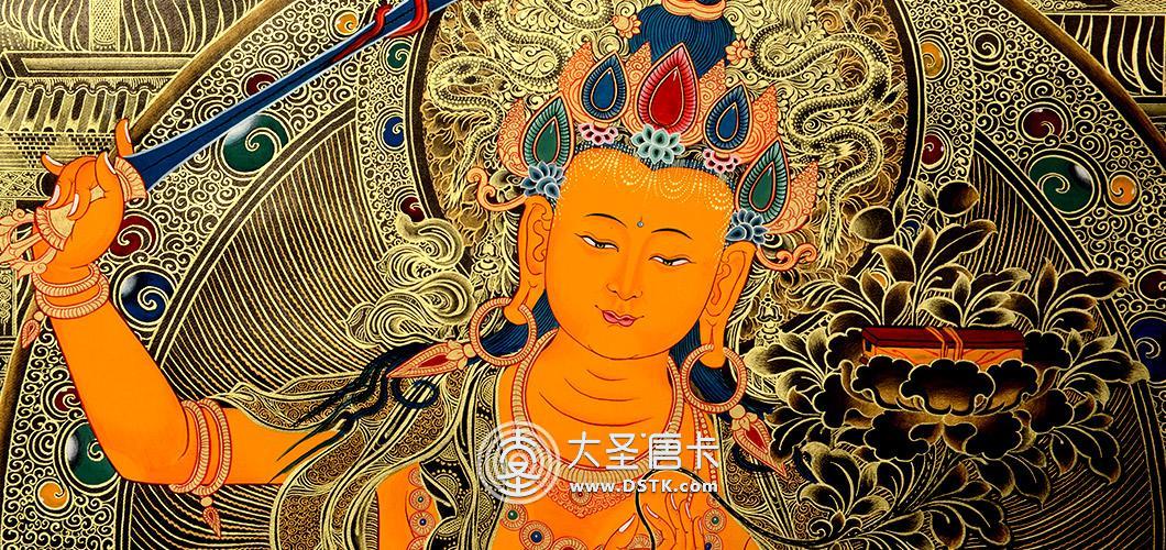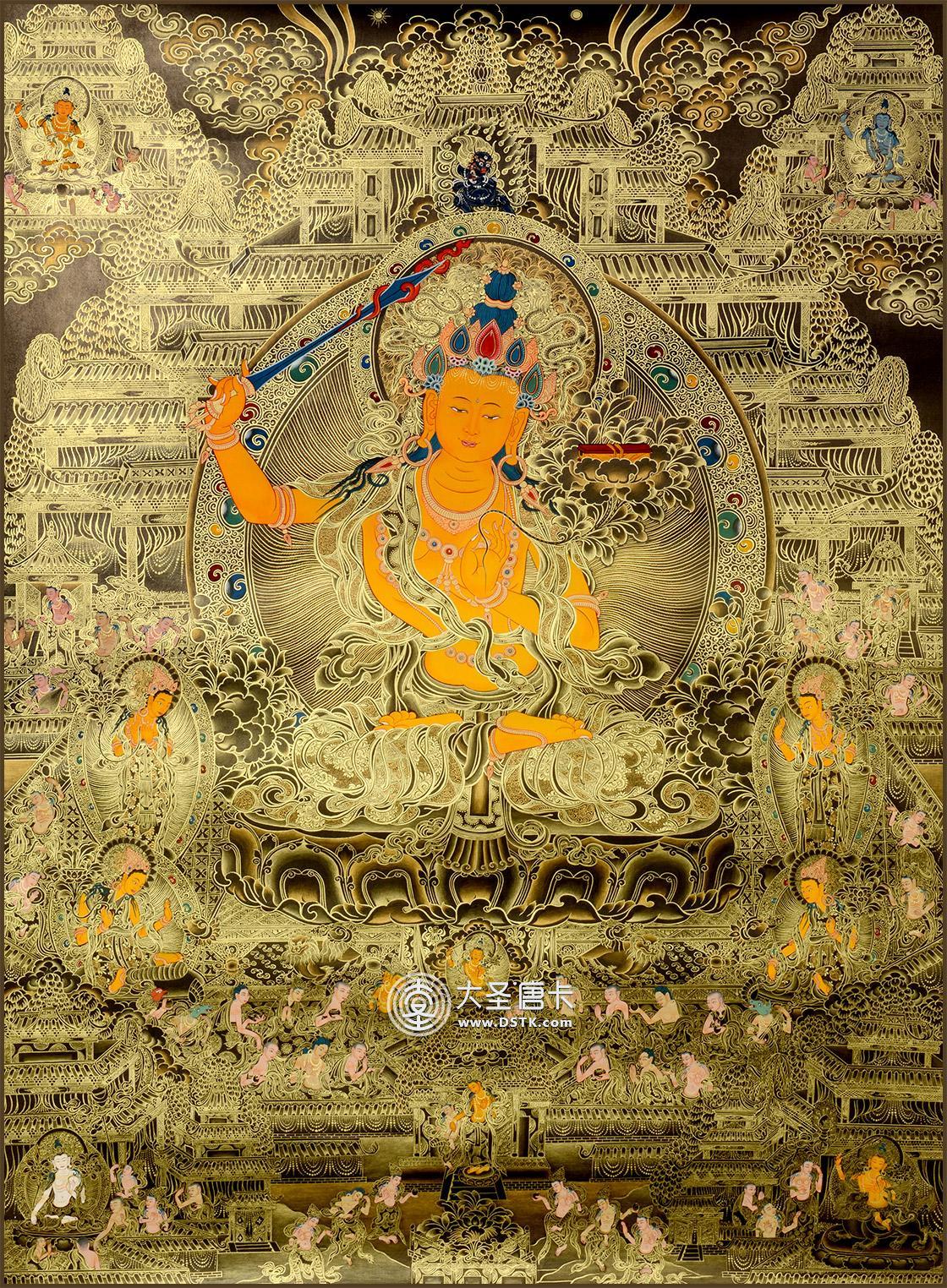 文殊菩薩又稱法王子,為智慧之象征,身金色,形如童子,五髻冠其項,右手持金剛寶劍(表示智能之利),能斬群魔,斷一切煩惱,左手持青蓮花,花上有金剛般若經卷寶,象征所具無上智慧,坐于蓮花臺上。