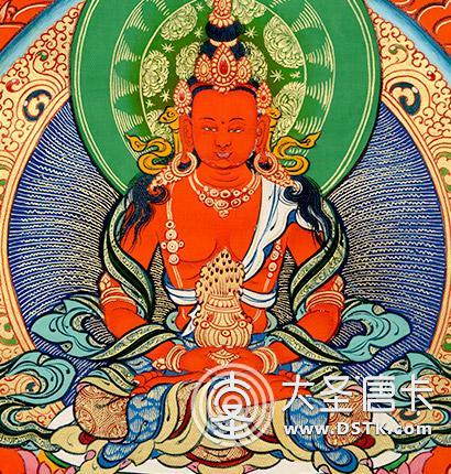 “長壽佛”是藏傳佛教中對“圣無量壽智決定光明王如來”的略稱,亦簡稱為“無量壽智如來”。一面二臂,肌膚紅色,盤發成髻戴五佛寶冠,上穿天衣,下著綢裙,身佩珍寶瓔珞,具足一切報身佛的種種莊嚴,雙手結禪定印于膝上,托長壽寶瓶。