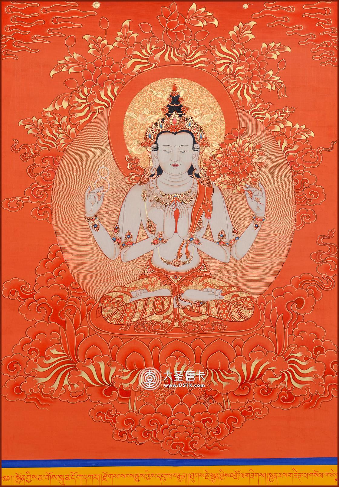 在此幅唐卡中,四臂觀世音菩薩以寂靜相于蓮花臺座結跏趺坐。左右主手當胸結一切王印,手捧摩尼寶珠。右次手捻水晶念珠,表示每撥一珠即為救度一眾生出脫輪回。左次手持蓮花,表示清凈無惱。四臂觀世音一首意為通達法性,四臂意為四無量心,身色潔白表示潔白無瑕,不被煩惱困擾。四臂觀世音菩薩雙眼注視著世間蒼生,表示被注視者可得到解脫。