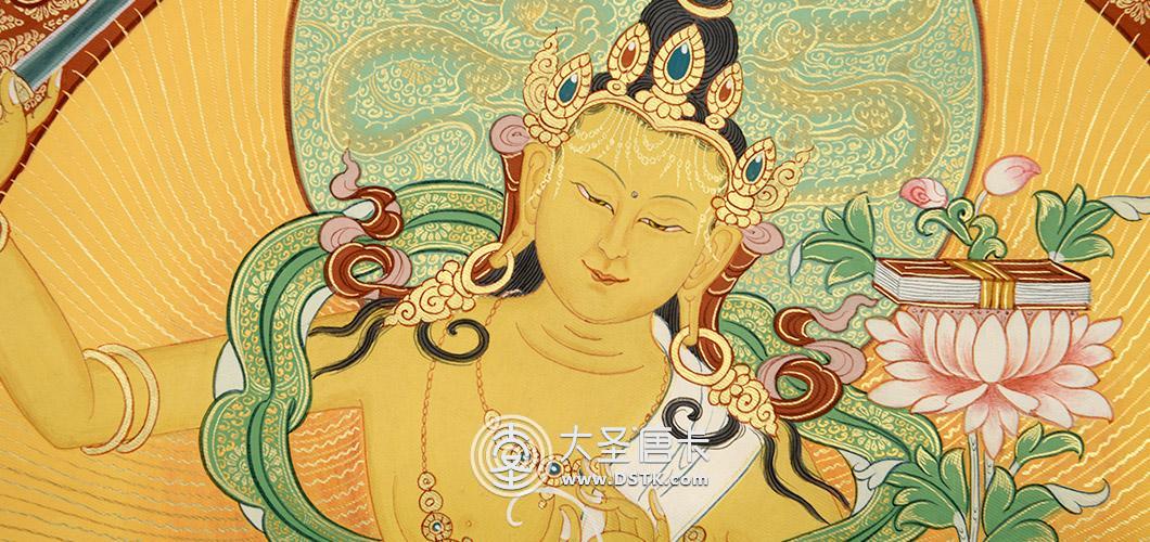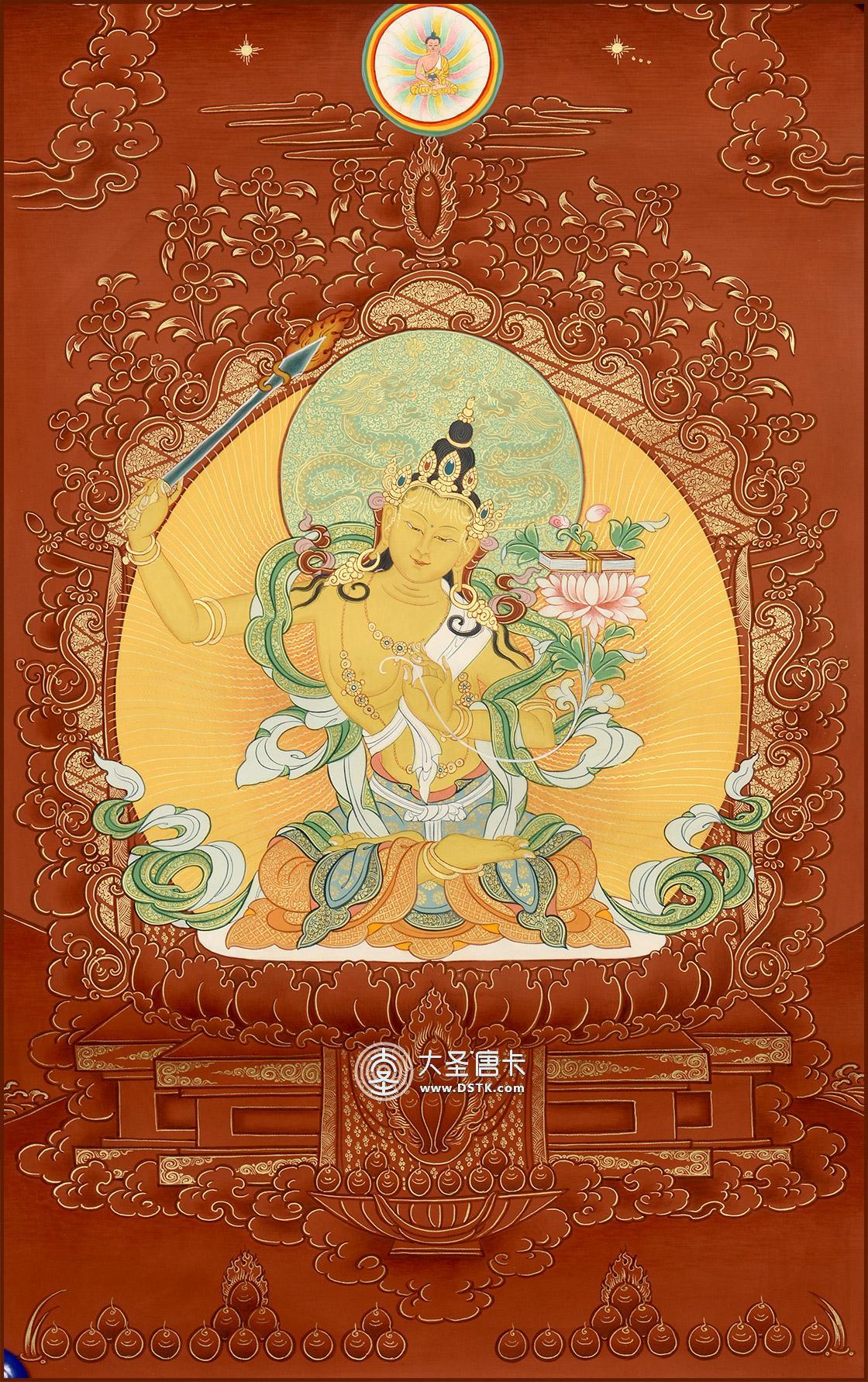 文殊菩薩又稱法王子,為智慧之象征,身金色,形如童子,五髻冠其項,右手持金剛寶劍(表示智能之利),能斬群魔,斷一切煩惱,左手持青蓮花,花上有金剛般若經卷寶,象征所具無上智慧,坐于蓮花臺上。