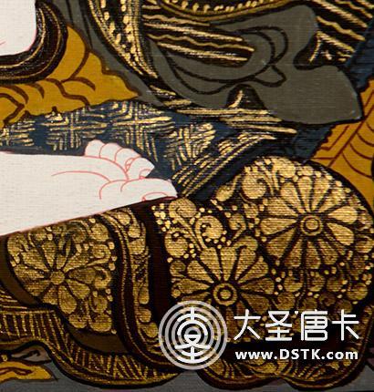 在繪制佛像服飾等位置時,用刻金技法,使圖案更具豐富的層次和立體感,用金勾勒的線條和圖案不但明亮度進一步提高,讓畫面更加燦爛,而且也使金在畫面上保持得更加長久。
